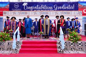 Front row, from left: The FNU Vice-Chancellor, Professor Unaisi Nabobo-Baba, the Chief Guest, Assistant Minister for the Ministry of Education, Honorable Iliesa Vanawalu, the FNU Chancellor and Council Chair, Mr Semesa Karavaki, the FNU Deputy Chair of Council, Dr Alisi Vudiniabola with members of the FNU Senior Leadersip Team at today’s graduation ceremony at the Vodafone Arena in Suva.