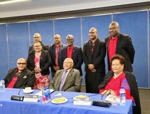 Back, from left: Pro Vice-Chancellor (Corporate), Tiko Domonakibau; Pro Vice-Chancellor (Learning & Teaching), Professor Jimaima Lako; Chief Financial Officer, Mr Nilesh Prasad; Dean of Graduate Affairs, Professor Nii-K Plange; Pro Vice-Chancellor (TVET), Dr Isimeli Tagicakivereta; Pro Vice-Chancellor (Research & Innovation), Professor Paul Iji.
