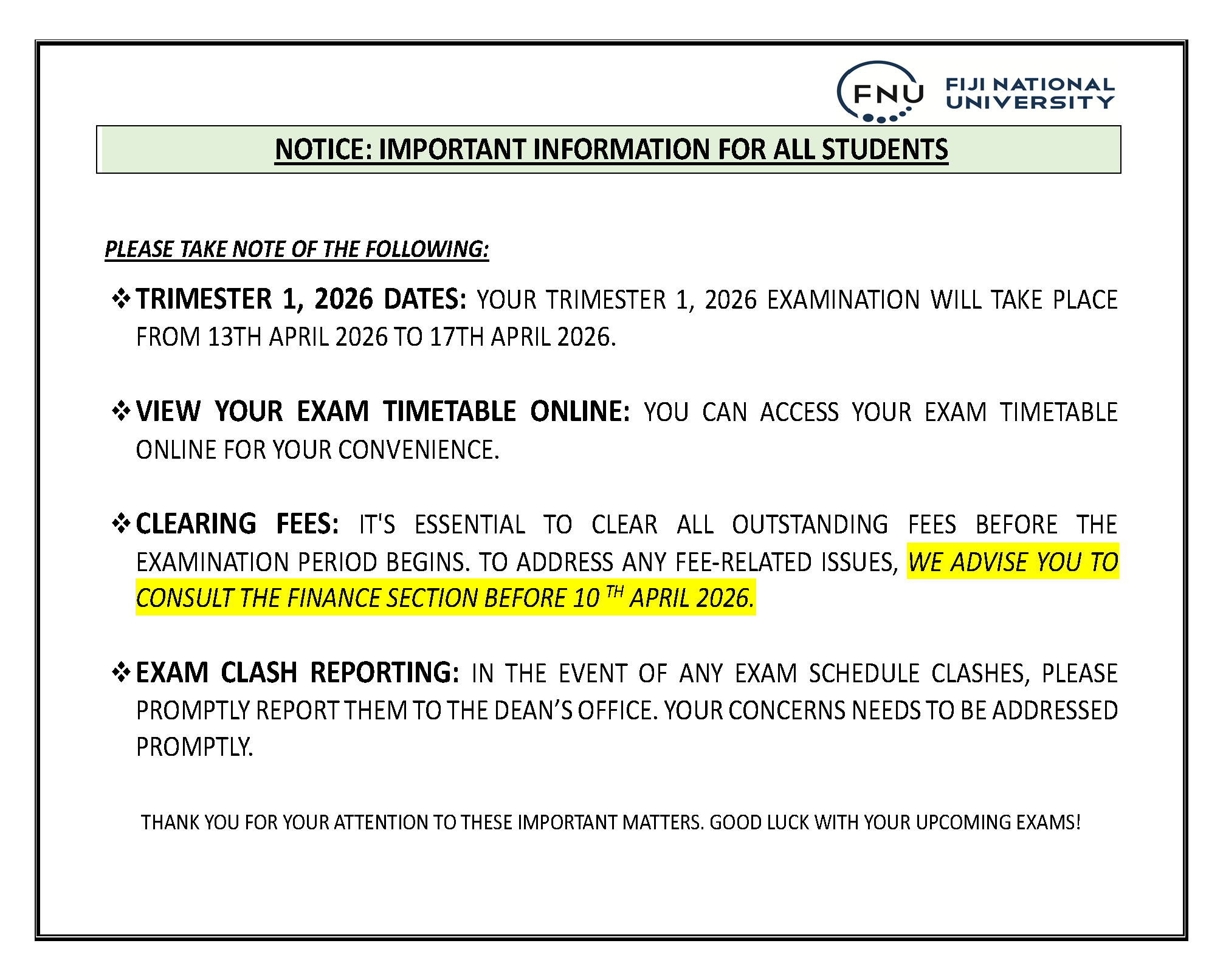 All Fees Must Be Cleared Prior to the Examination. Students are advised to see the Finance section for any fees issues as soon as possible before their final examination date.