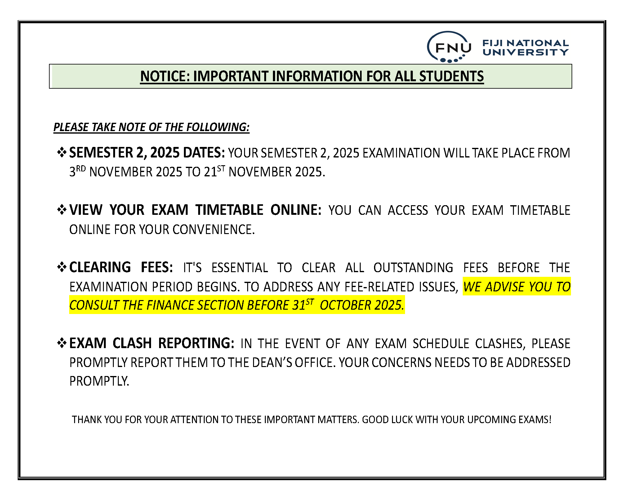 All Fees Must Be Cleared Prior to the Examination, Students Are Advised to See the Finance Section for Any Fee Issues as Soon as Possible Before Their Final Examination Date.