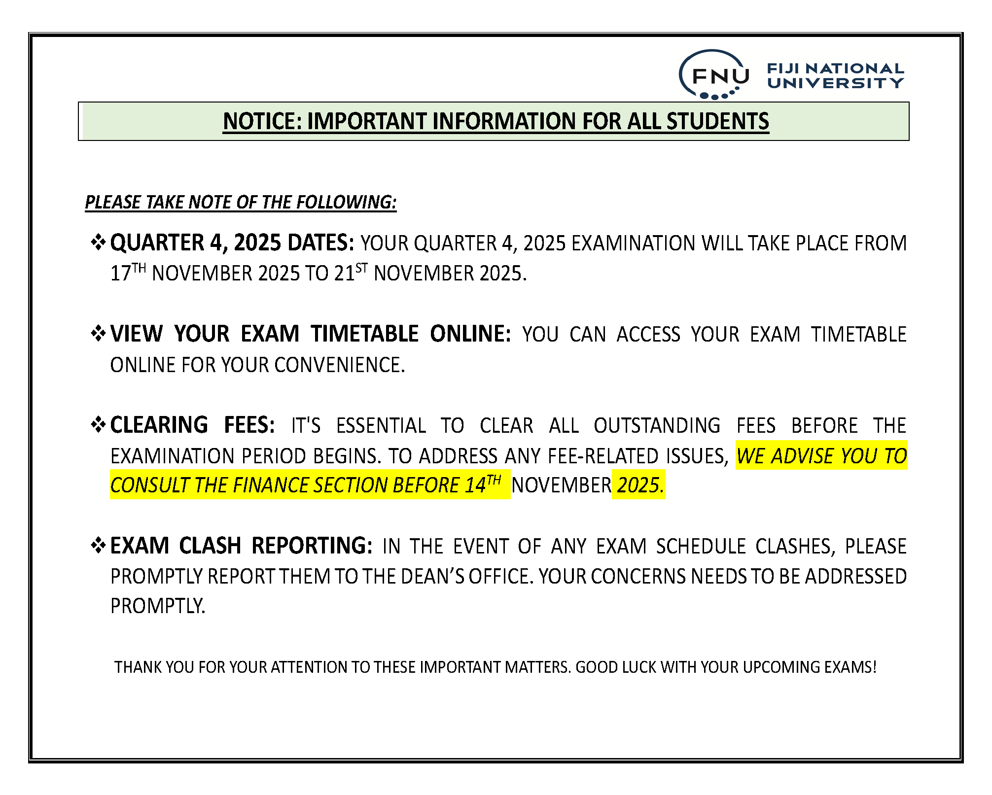 All Fees Must Be Cleared Prior to the Examination.